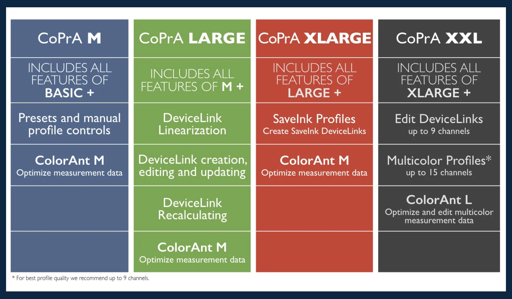 CoPrA is considered the perfect control center for any profiling task as it enables users to produce high-quality profiles with just a few clicks using simple easy-to-use tools. CoPrA can easily create Printer, DeviceLink, and SaveInk high-quality ICC profiles with multicolor options for day-to-day color management challenges.